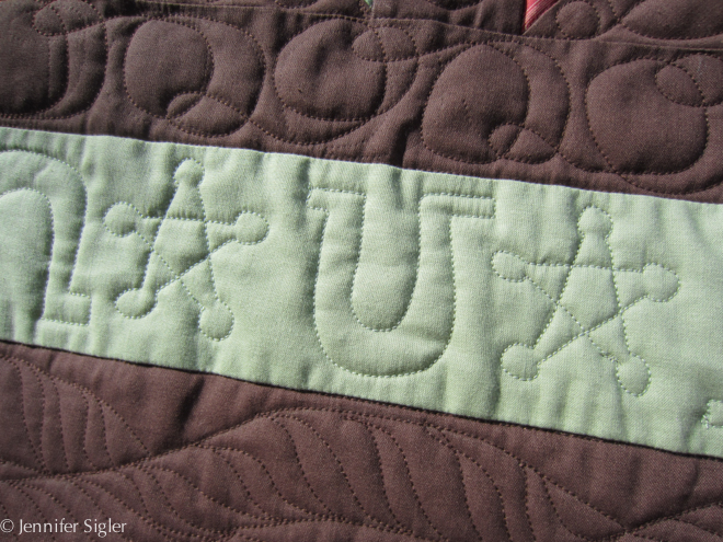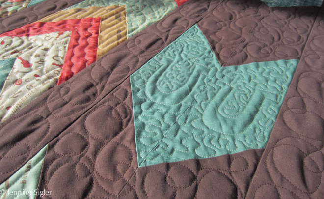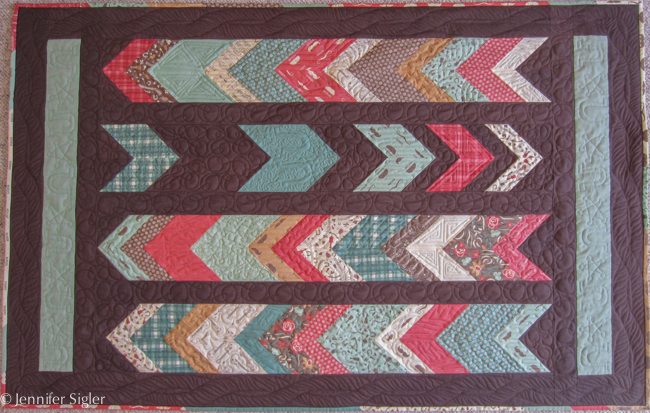 It IS possible to use fleece for backing. It stretched a little on the longarm, but not too badly. If the quilt was any larger, I think I would have had problems. How to make chevrons the hard way: try sewing strips of fabric in a stair step, measured just right in order to save as much fabric as possible, and then discover you measured incorrectly by 1/4″. Again. And again. I think the result is super cute, but I won’t make chevrons that way again. I’ll swallow the urge to be frugal and save some time instead.