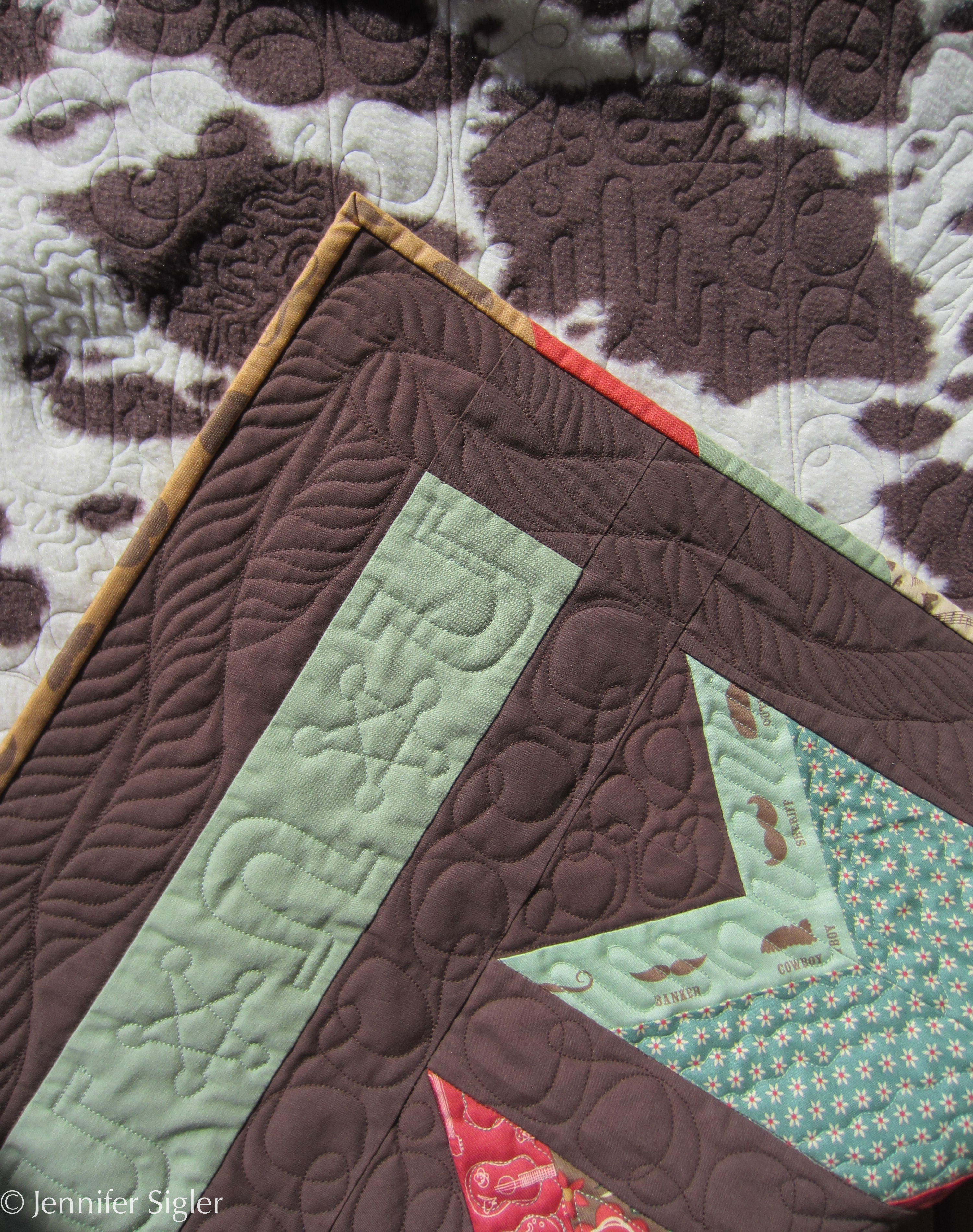 The most fun part of this baby quilt was coming up with free motion cowboy designs to match Moda’s Honky Tonk fabric collection. Rope, horseshoes, and sheriff’s stars were fun to try.