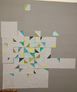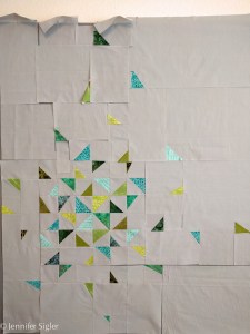 I designed this baby quilt for a woodland nursery with tints of green and teal. This spring leaf pile is just starting to get dispersed by the wind. At least, that was my design inspiration. I also wanted the half-square triangles (HSTs) to begin to ‘melt’ as they got farther from the center of the pile–almost like new grass coming up through the snow.
