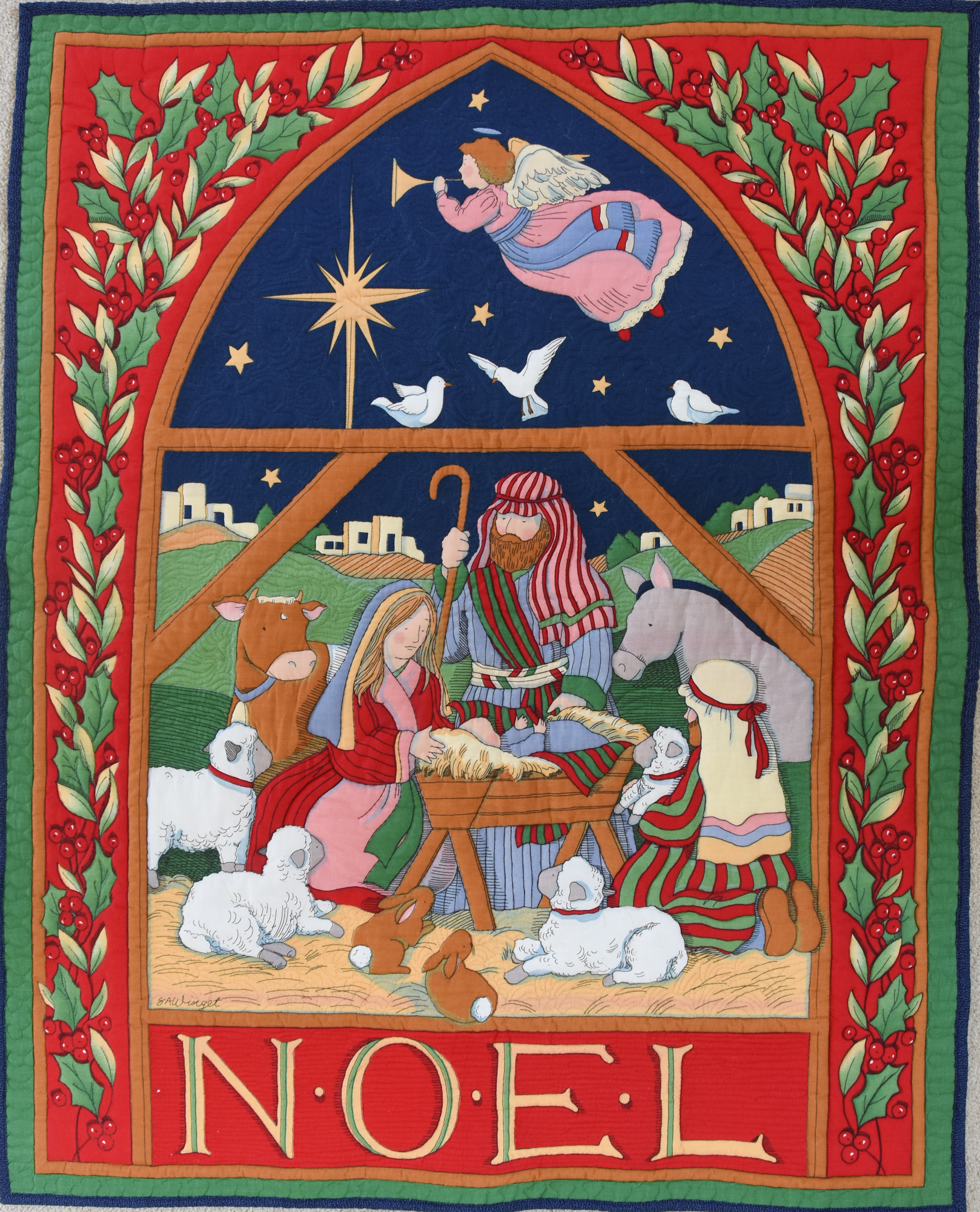 My mom started me on this project with an embroidery hoop and a needle and thread. I finished it on my domestic machine, needless to say. Now it hangs in my little girl’s room during Christmas time.