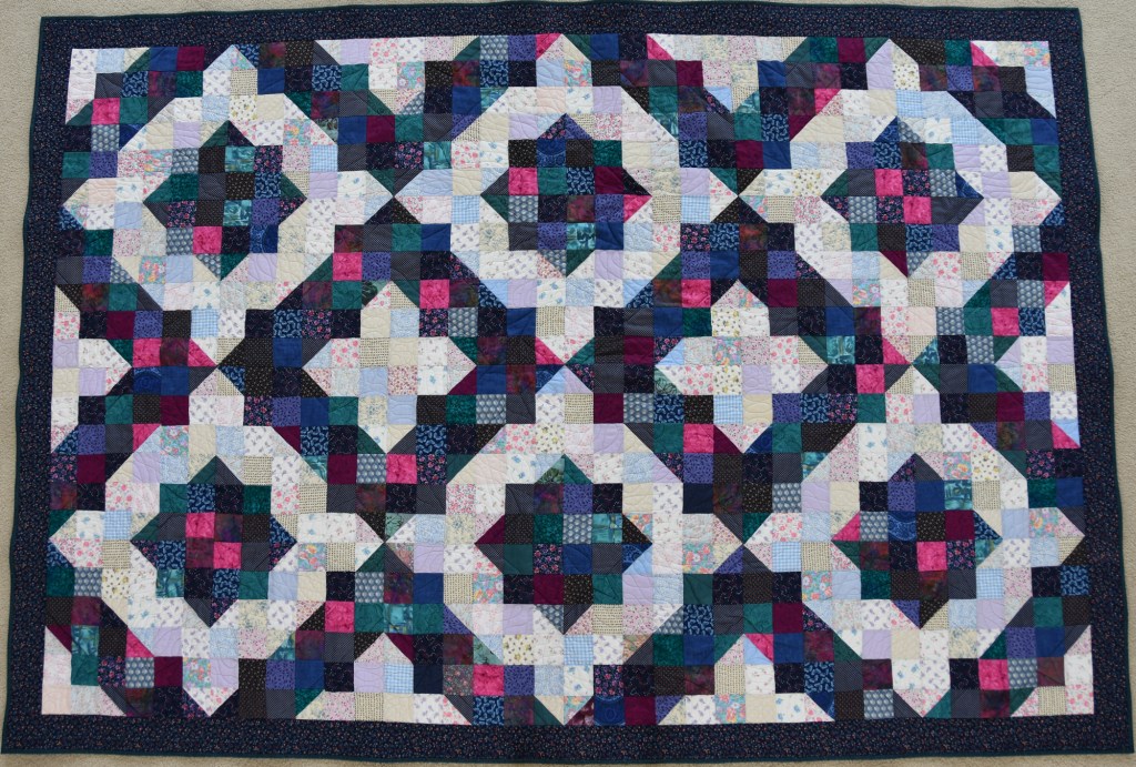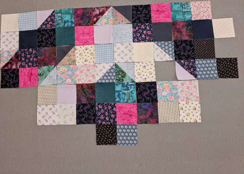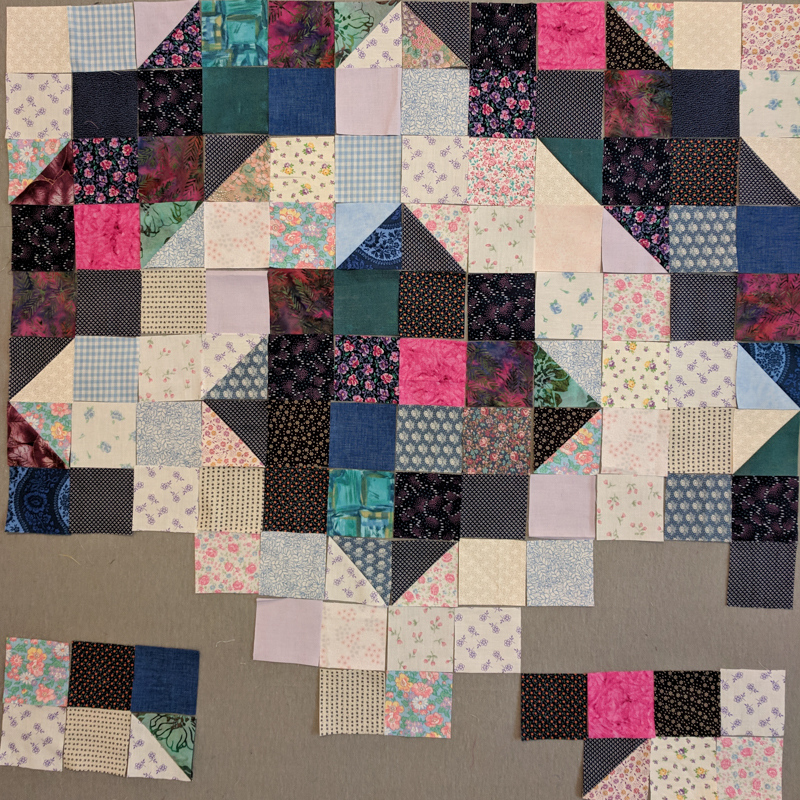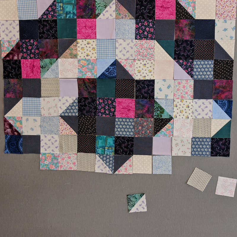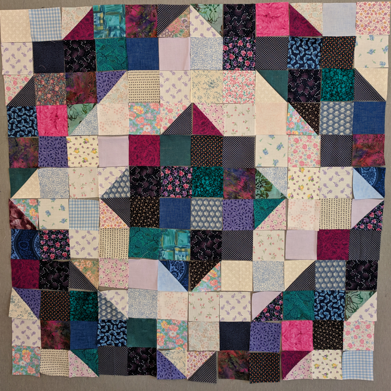 This quilt top has 864 squares that create a design through their color value–their darkness or lightness, so to speak. The success of the design depends less on having fancy new fabric and more on choosing light and dark values, so…. it’s a great option for old scraps!
