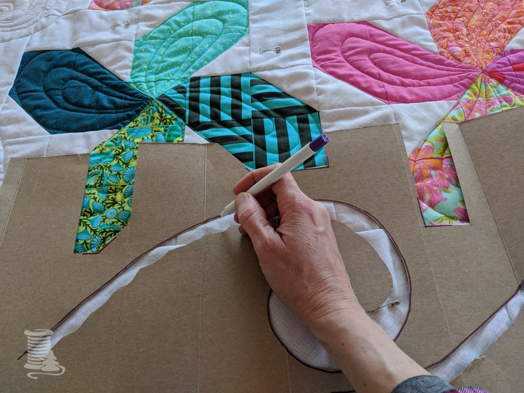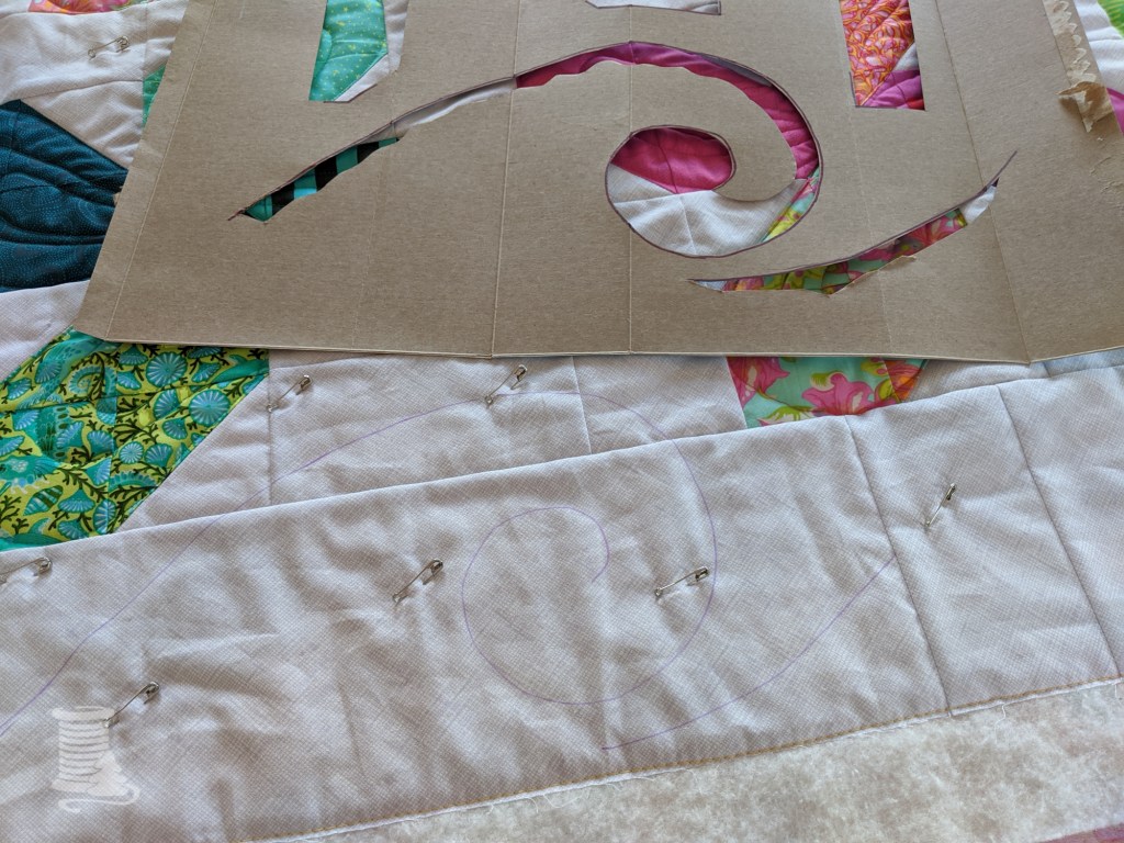 Using a domestic sewing machine for quilting poses a challenge when I want to quilt large designs. I’m limited by how far I can smoothly move my quilt without relocating my hands. On a domestic machine, that’s only a few inches. To achieve the large rolling wave designs, I created a stencil, marked the quilt, and quilted an outline. I came back later and improvised the rest of the lines.
