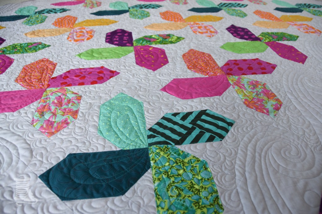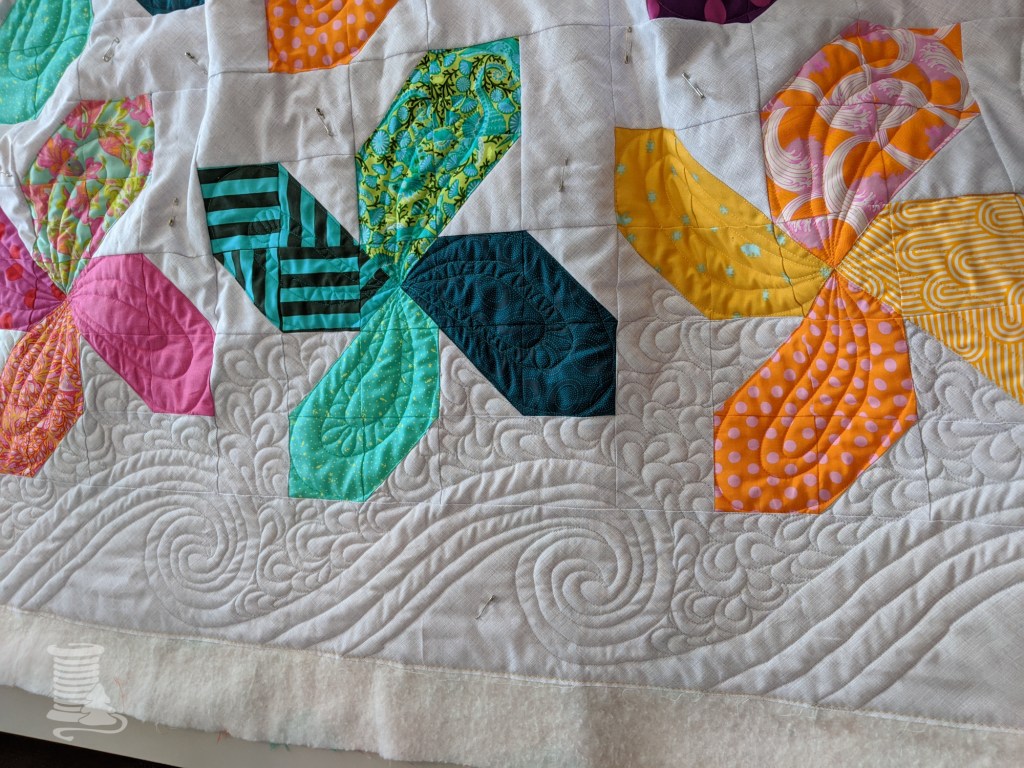 Working with bright fabric is fun. This twin-sized quilt will be a cheery addition to my niece’s bedroom, and it cheered me up while I was working on it this February… March, April. The ocean motif on some of the fabric inspired the mussel shell background texture and the rolling waves in the border.